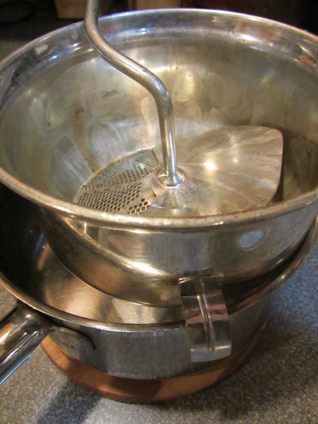 Food mill placed over saucepan.