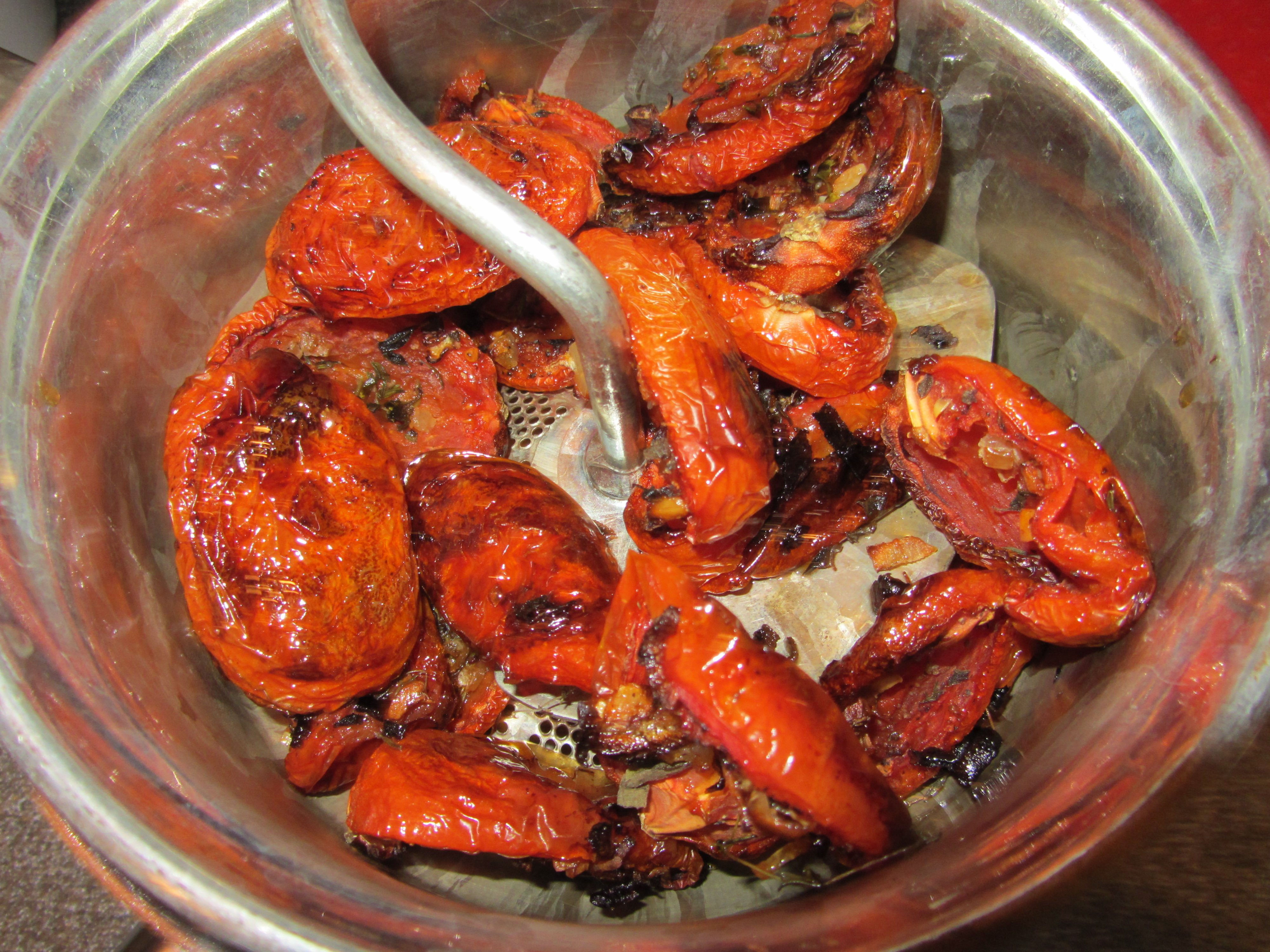 Pressing tomatoes through food mill.