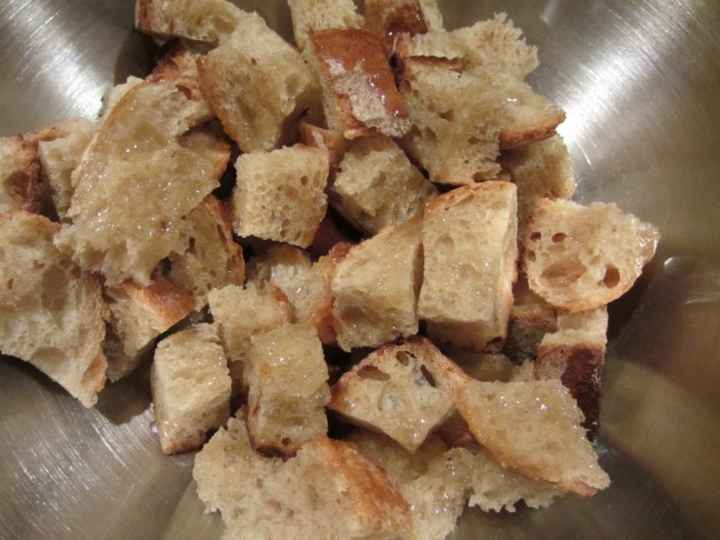 Dried bread cubes tossed with bacon drippings.