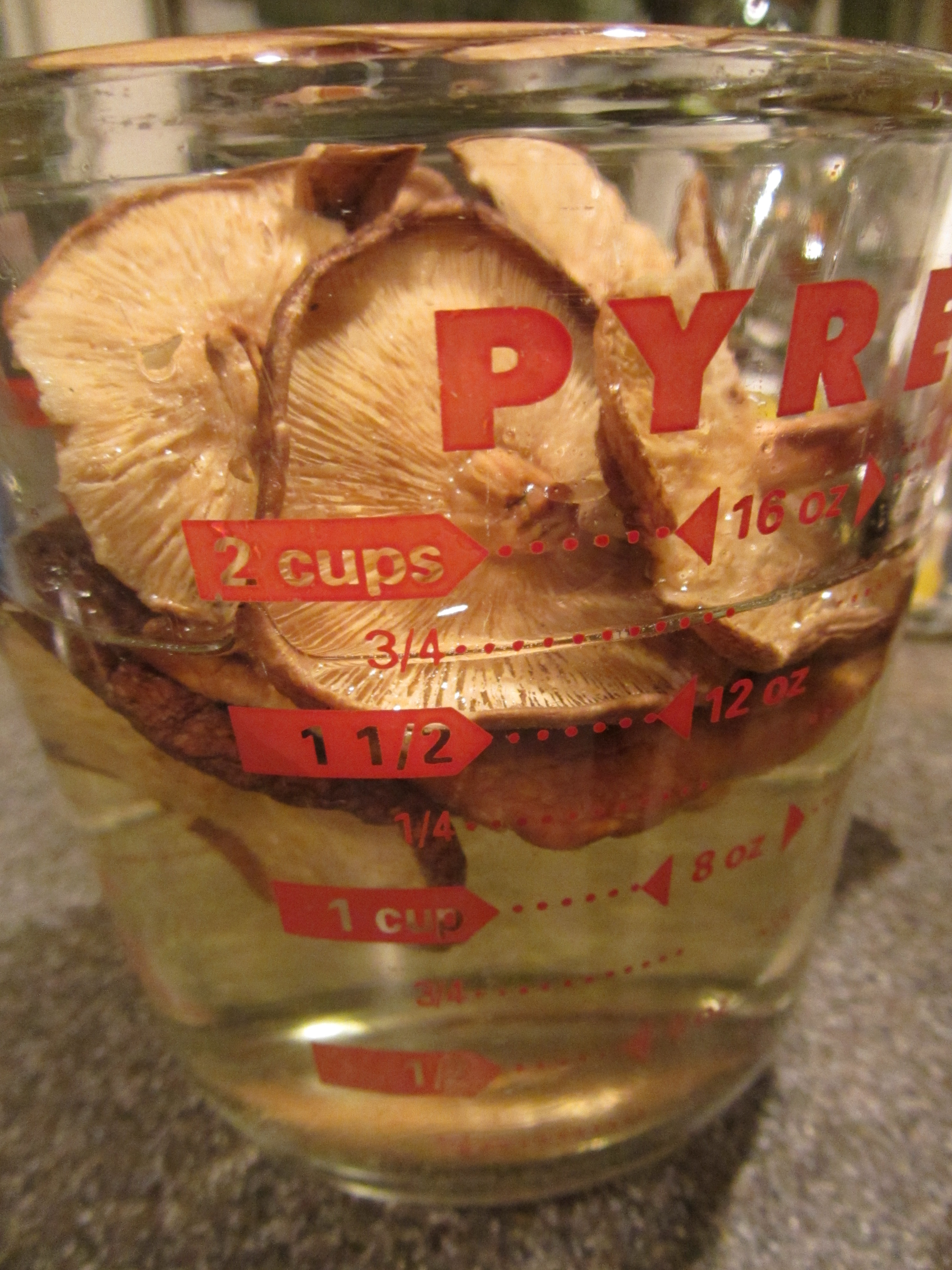 Dried shiitakes, rehydrating in water and sauvignon blanc.
