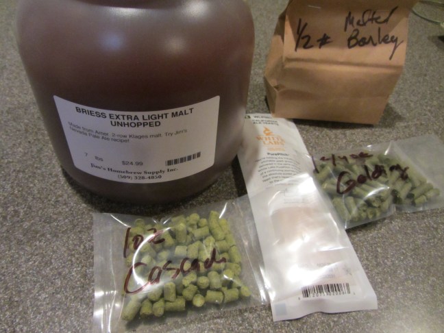 Malt extract, milled barley, Cascade hops, Kent Goldings hops, and pitchable yeast.