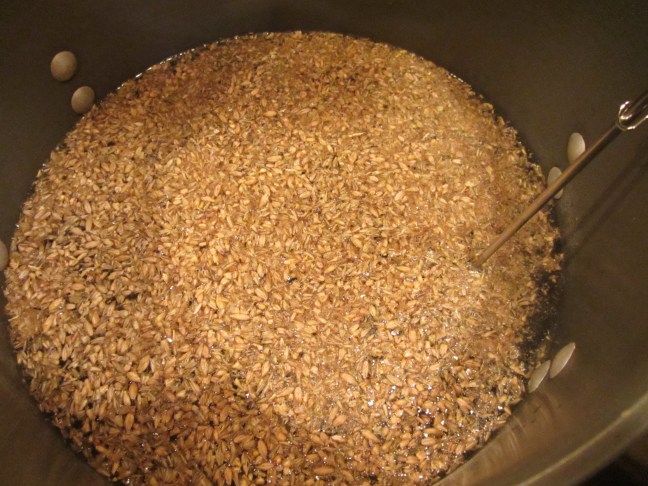 Barley added to two gallons of bottled water, and probe thermometer inserted.