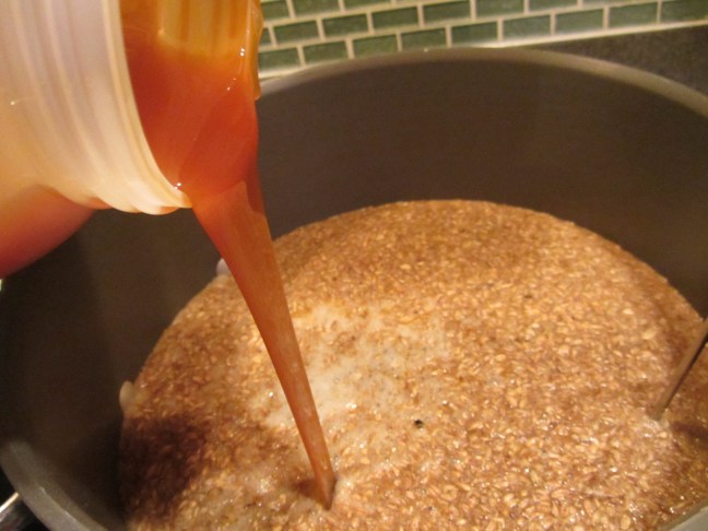 Warmed malt extract being added to the pot.