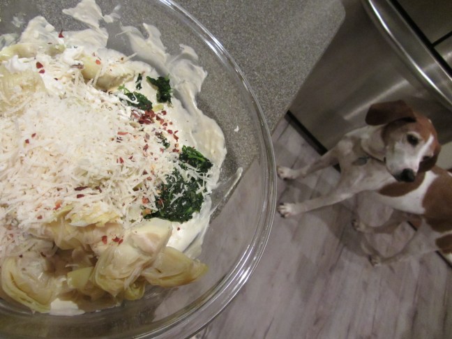 Spinach, artichoke hearts, Parmesan, red pepper flakes, garlic powder, and Kosher salt added to dip base.