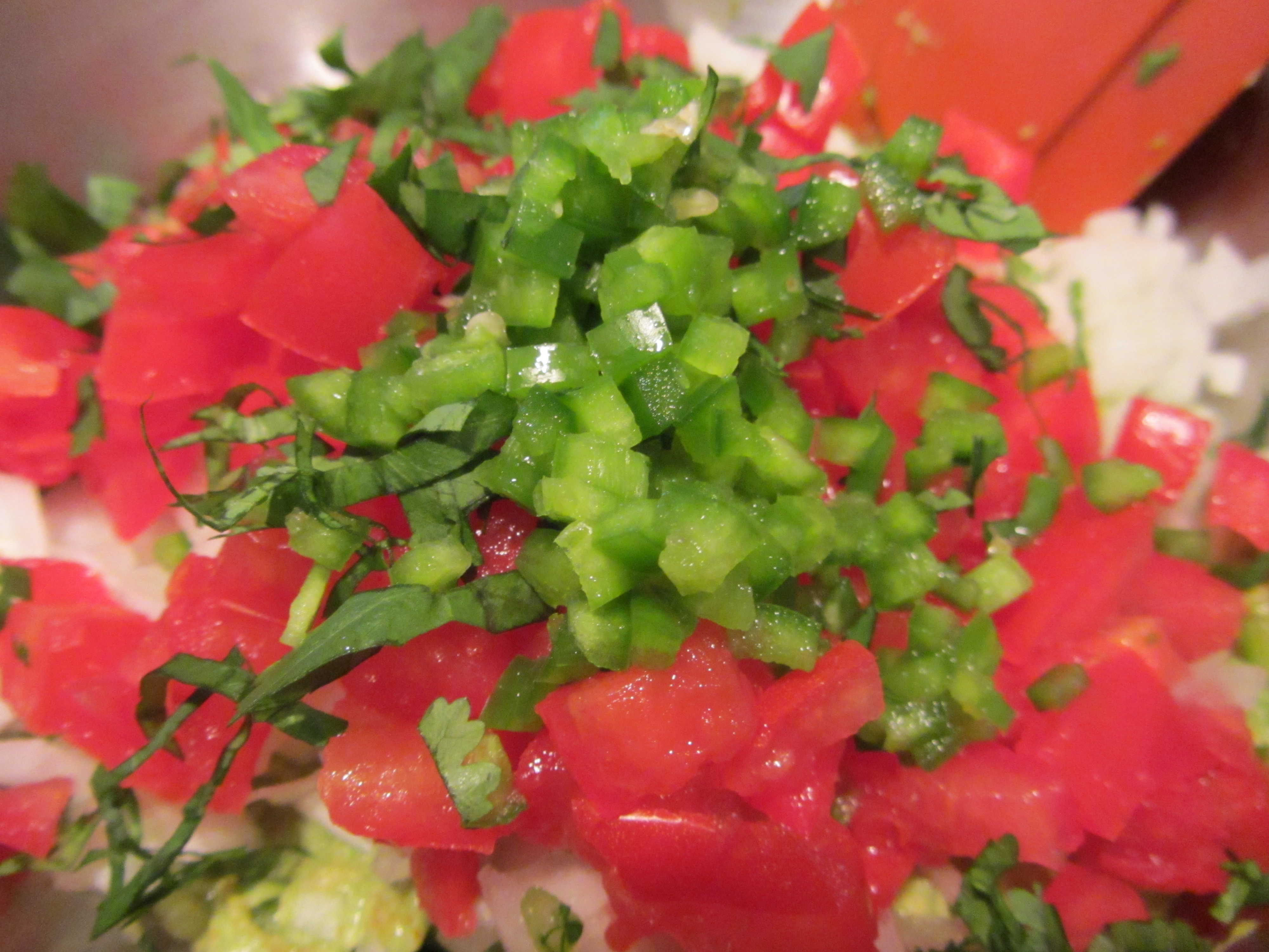 Half of a jalapeno, seeded, and added to the bowl.