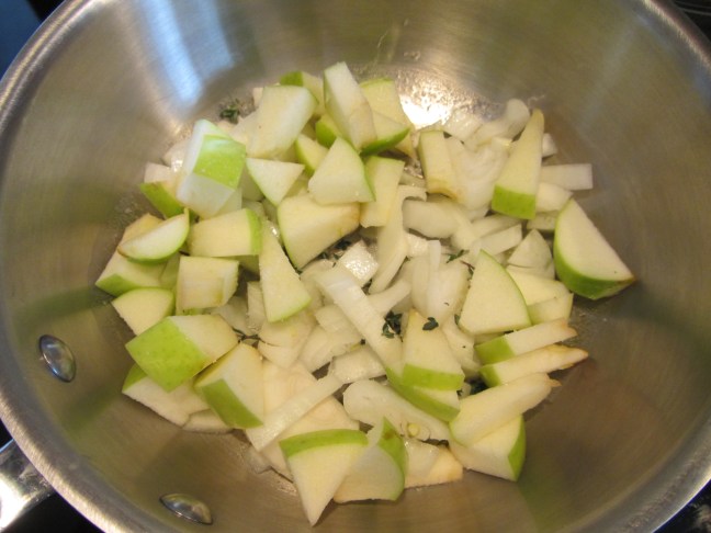 Onion, apple, thyme, and Kosher salt added to melted butter.