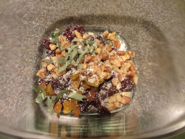 Dried cherries, golden raisins, walnuts, fresh sage, Kosher salt, and pepper.