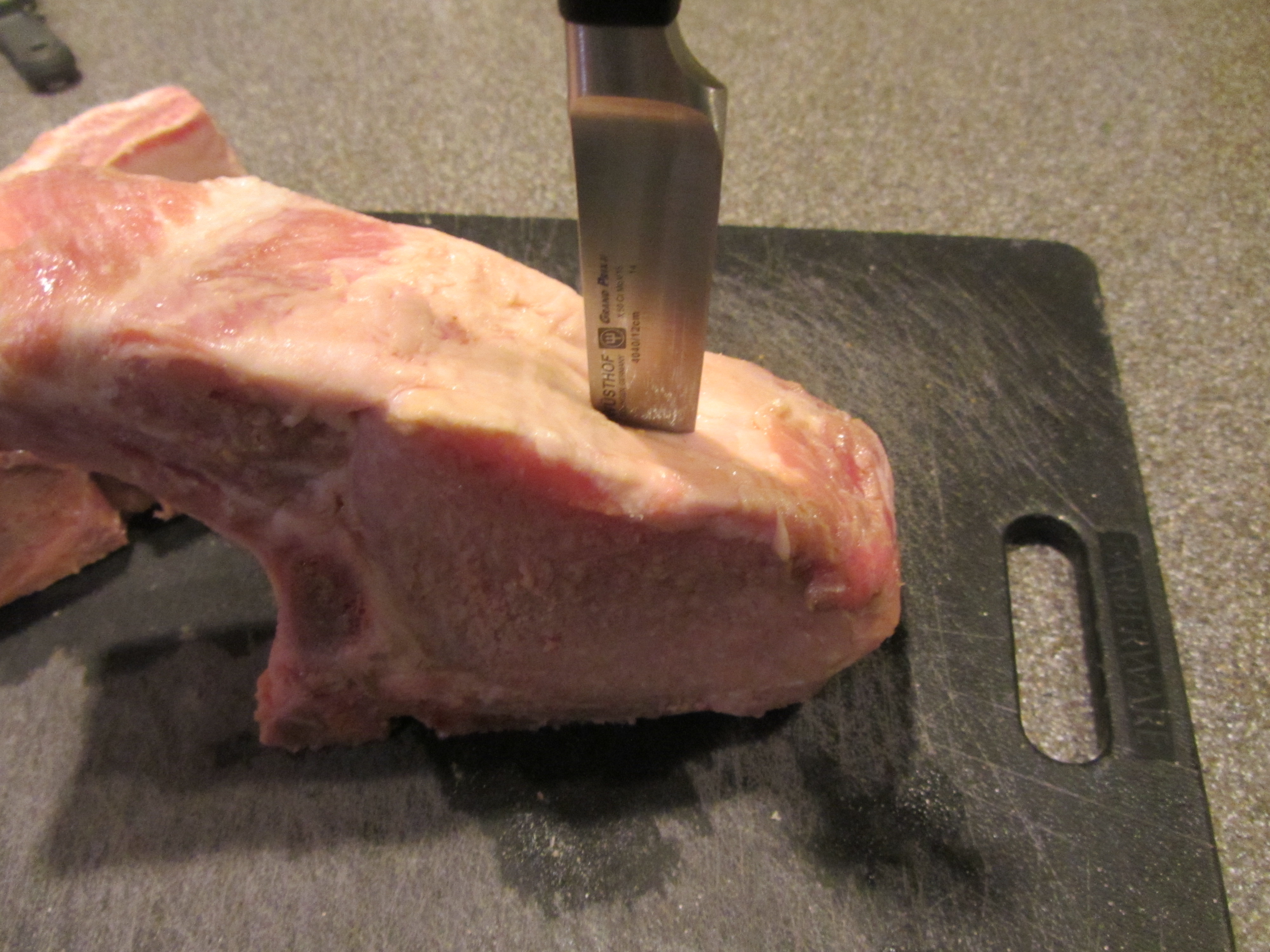 Cutting pockets in pork chops by inserting knife straight down to bone, then cutting up toward the surface.
