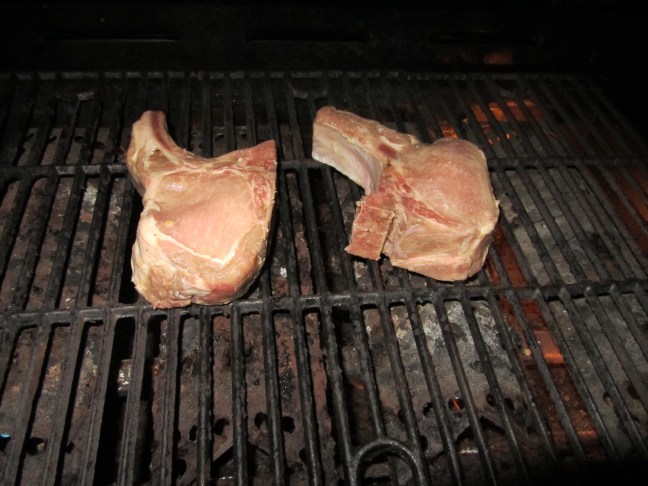 Pork chops on the grill for 2 minutes.
