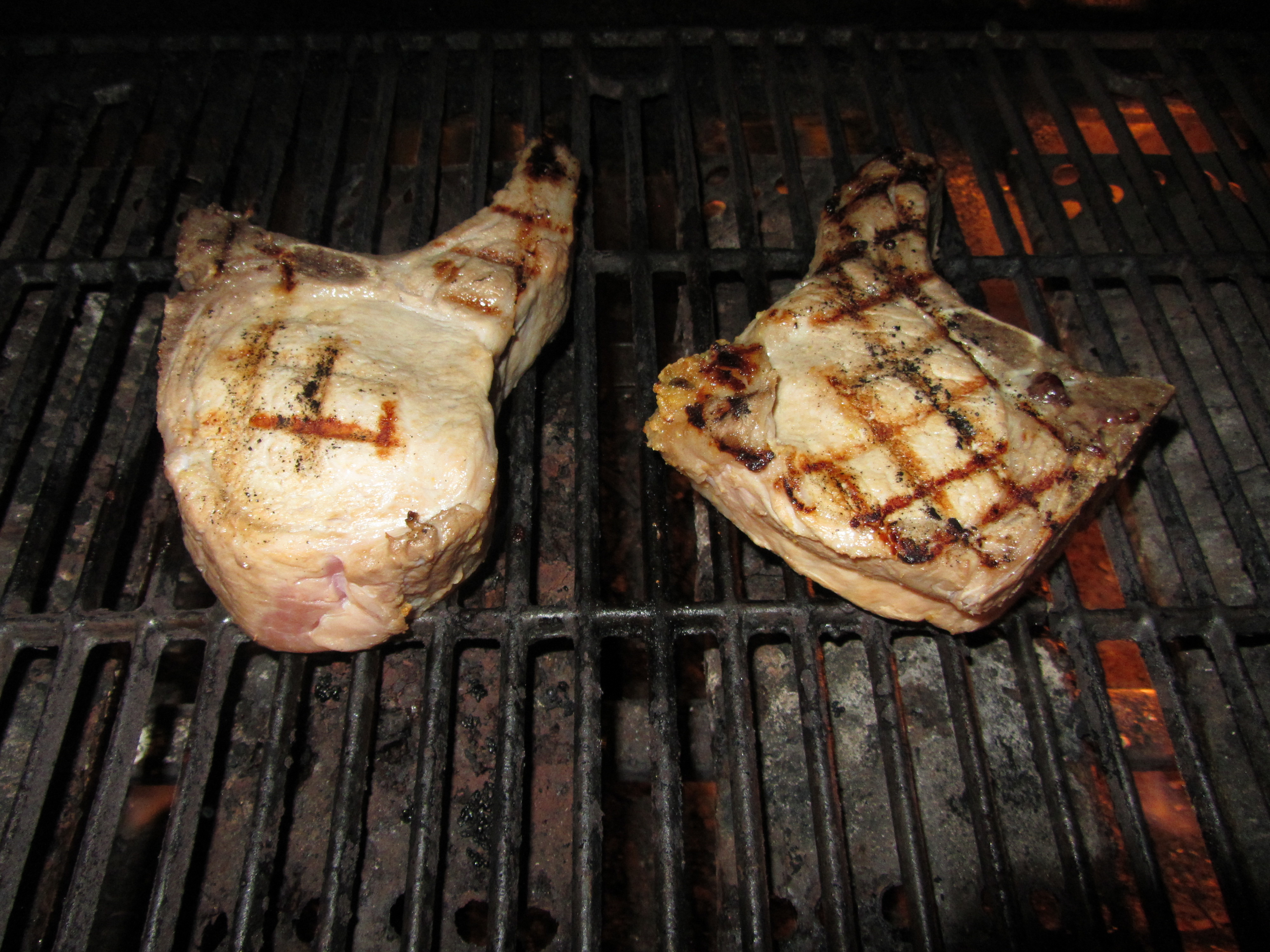 Pork chops, flipped after 4 minutes of cooking. Left to cook 2 more minutes.
