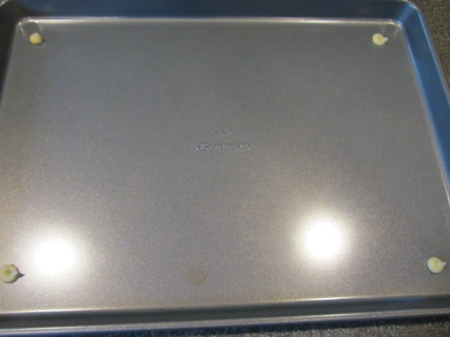 Dollops of dough piped onto sheet pan to keep parchment from sliding.