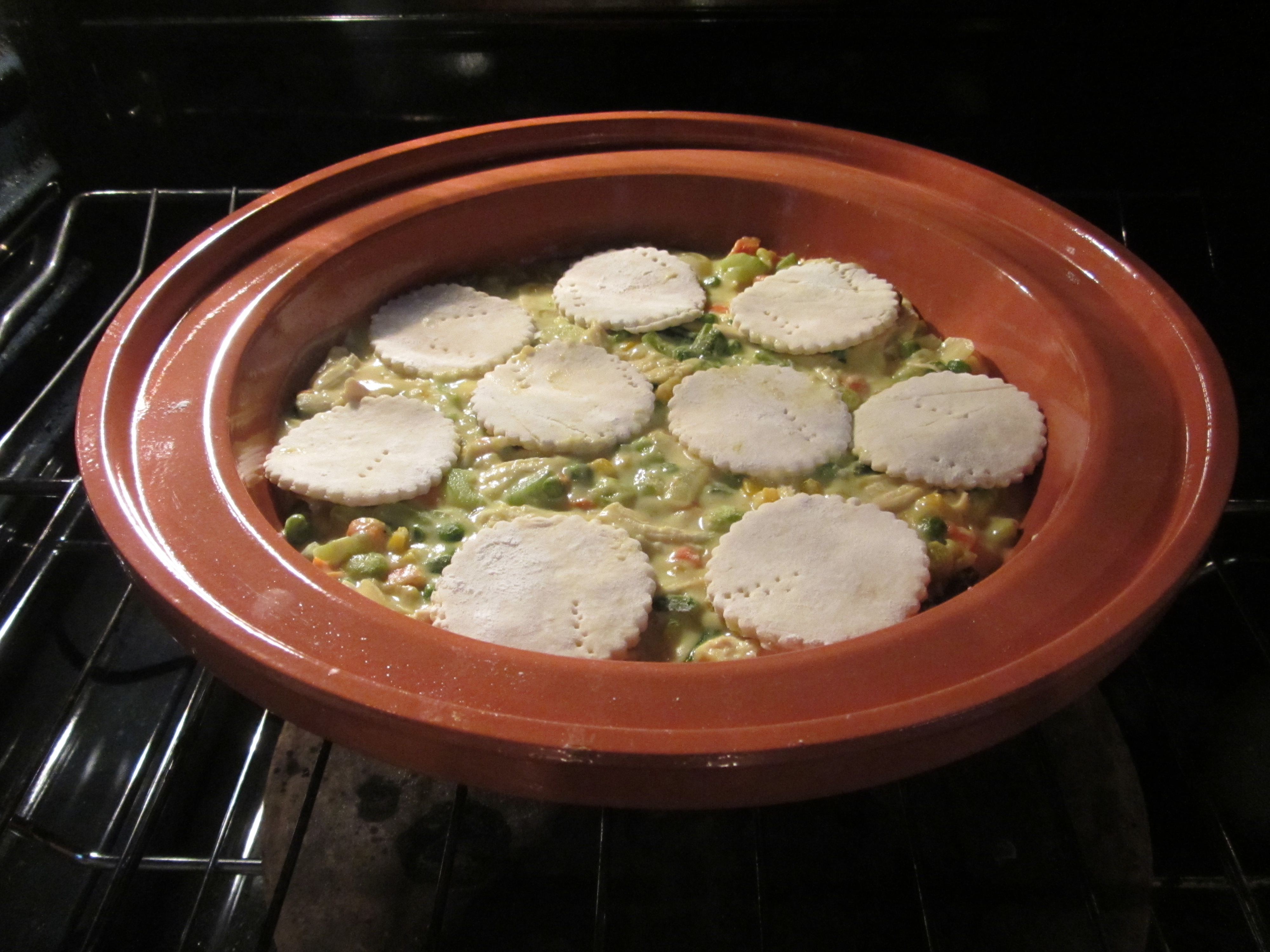 Rounds of puff pastry placed on chicken mixture, and placed in oven.