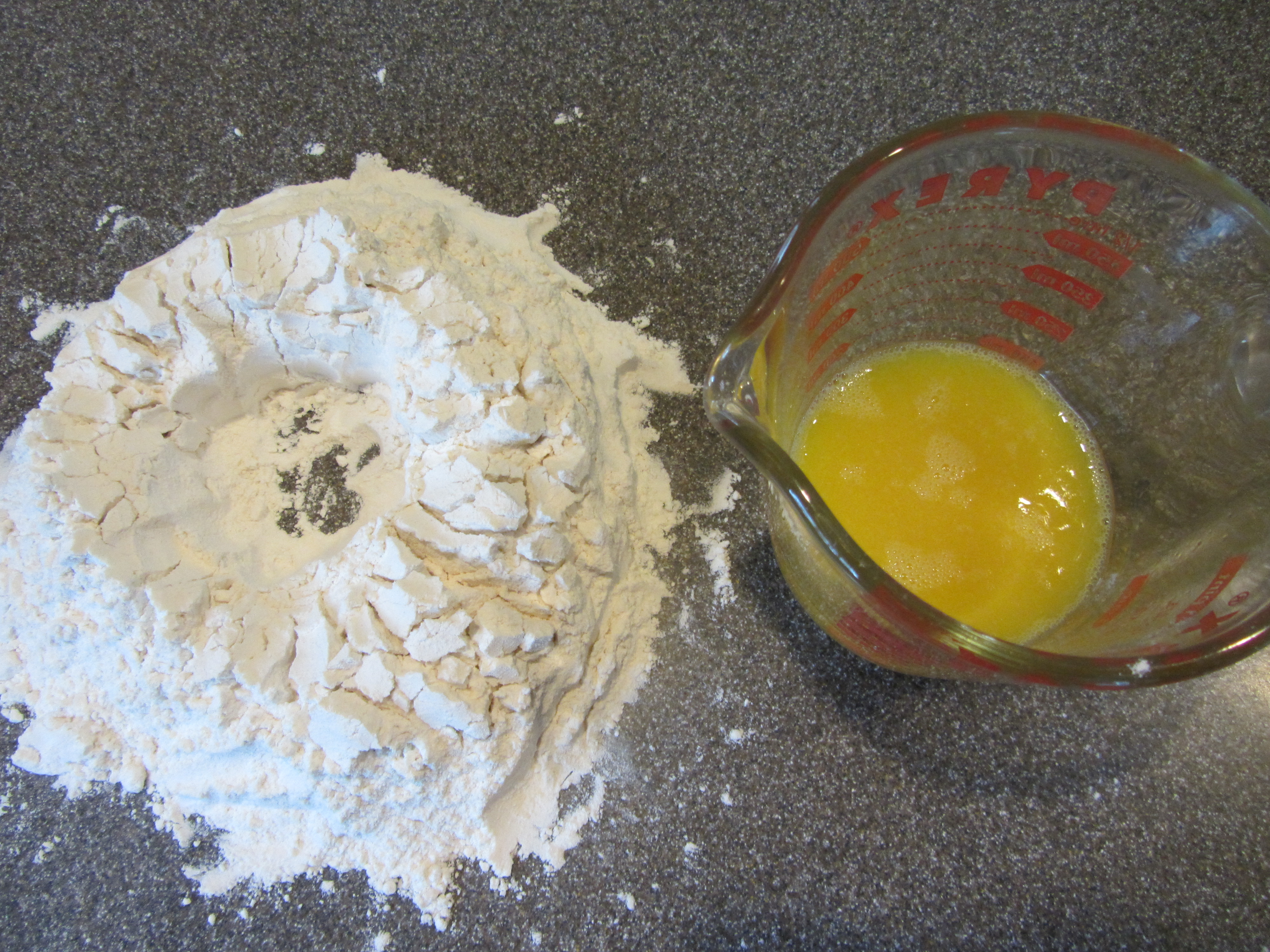 Ingredients for pasta dough: flour, eggs, water, salt, and olive oil. A well made in the flour.