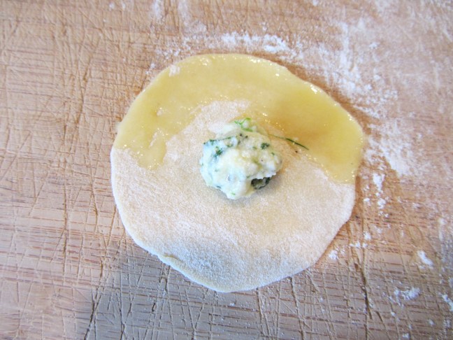 Filling placed in the center of the dough, and one edge brushed with egg wash.