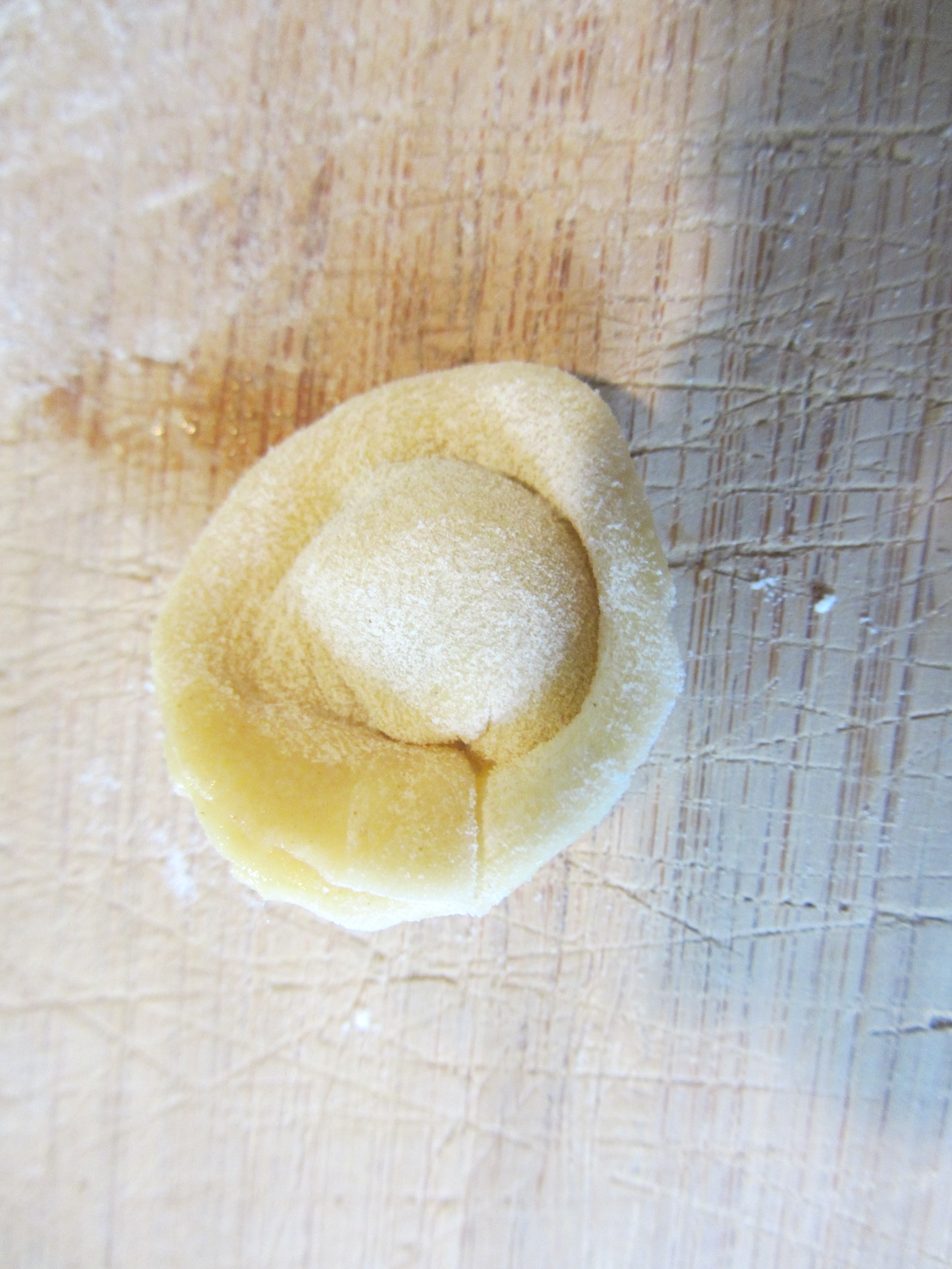 Points of the dough pulled together to form a tortellino.