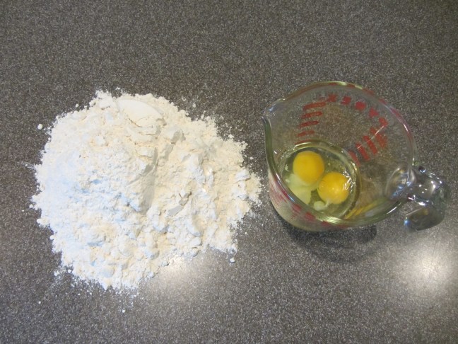 Ready to make fresh pasta – a mound of flour and a mixture of eggs, water, salt, and olive oil.