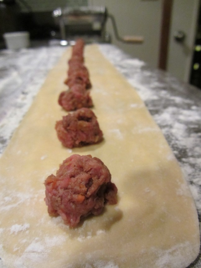 Balls of meat filling placed on dough sheet.