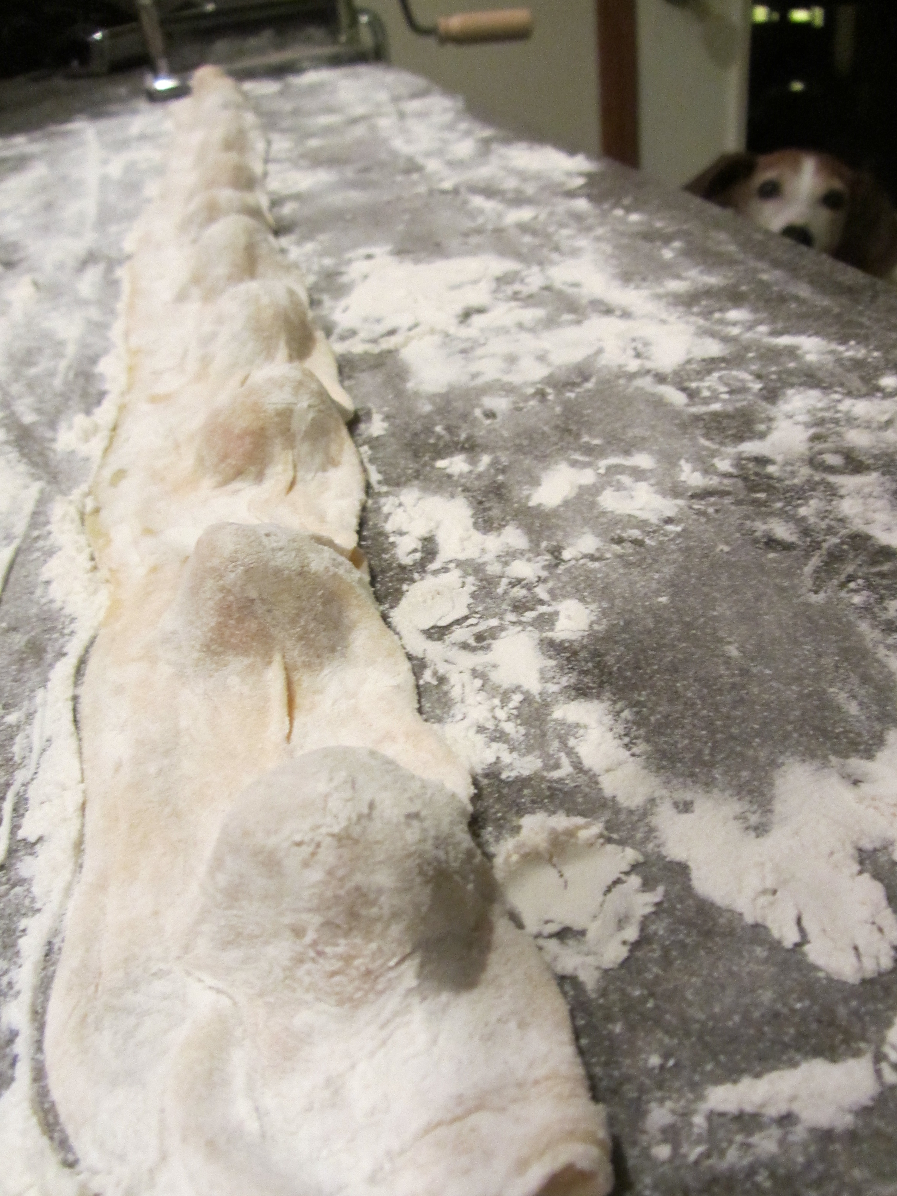 Excess dough folded over filling, and pressed to remove air bubbles.