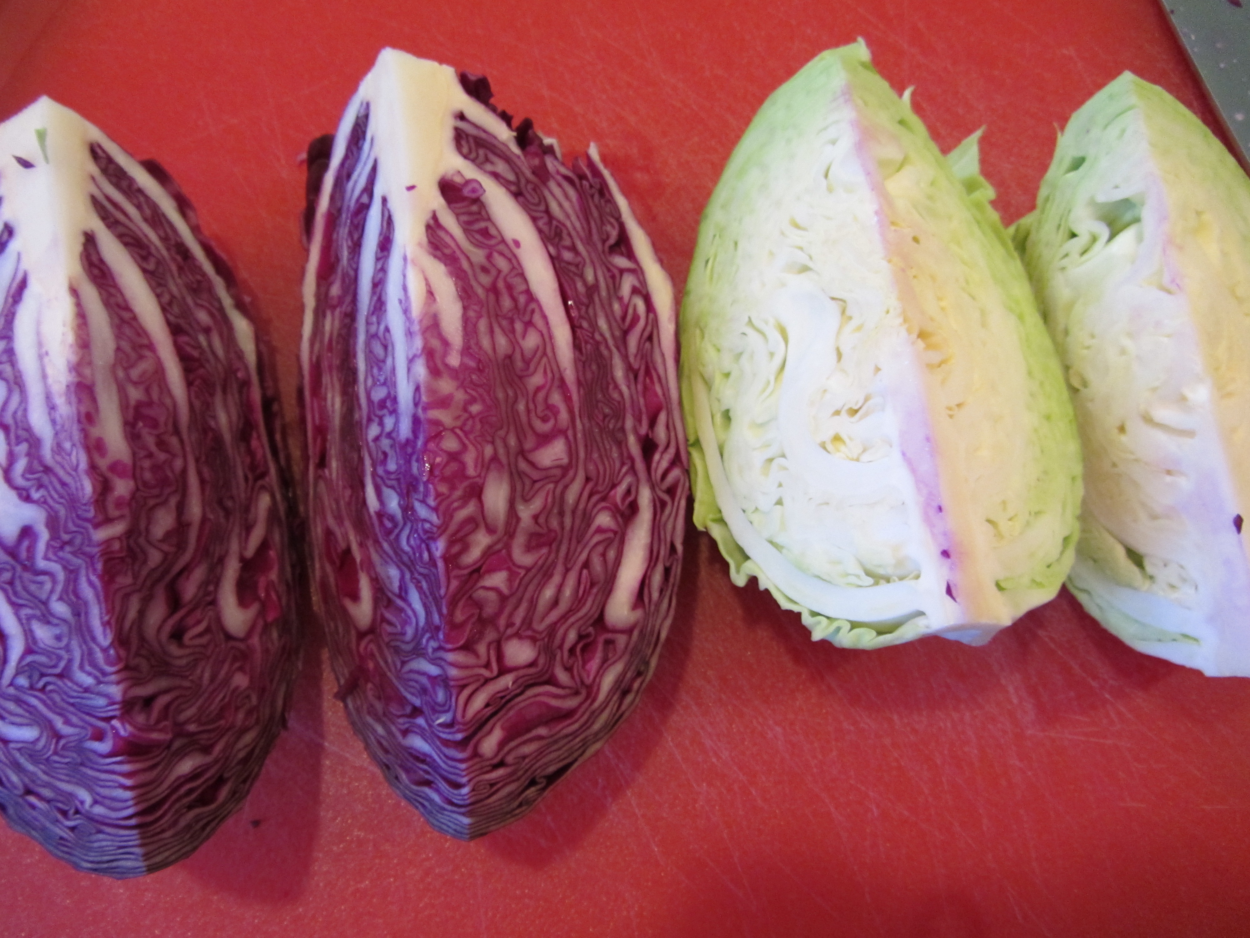 Half a head each of red and green cabbage.