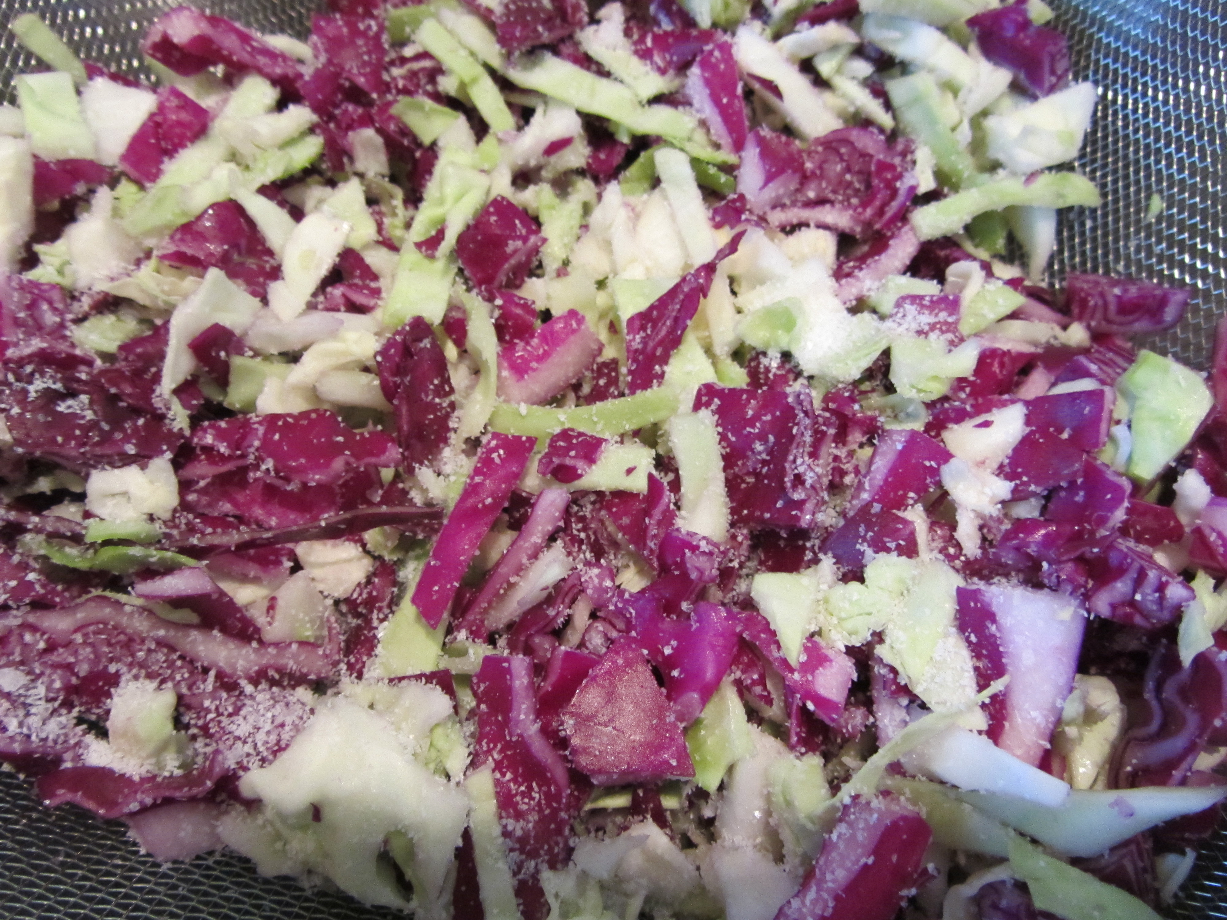 Cabbage, tossed with lots of Kosher salt, and left to drain for a couple hours.