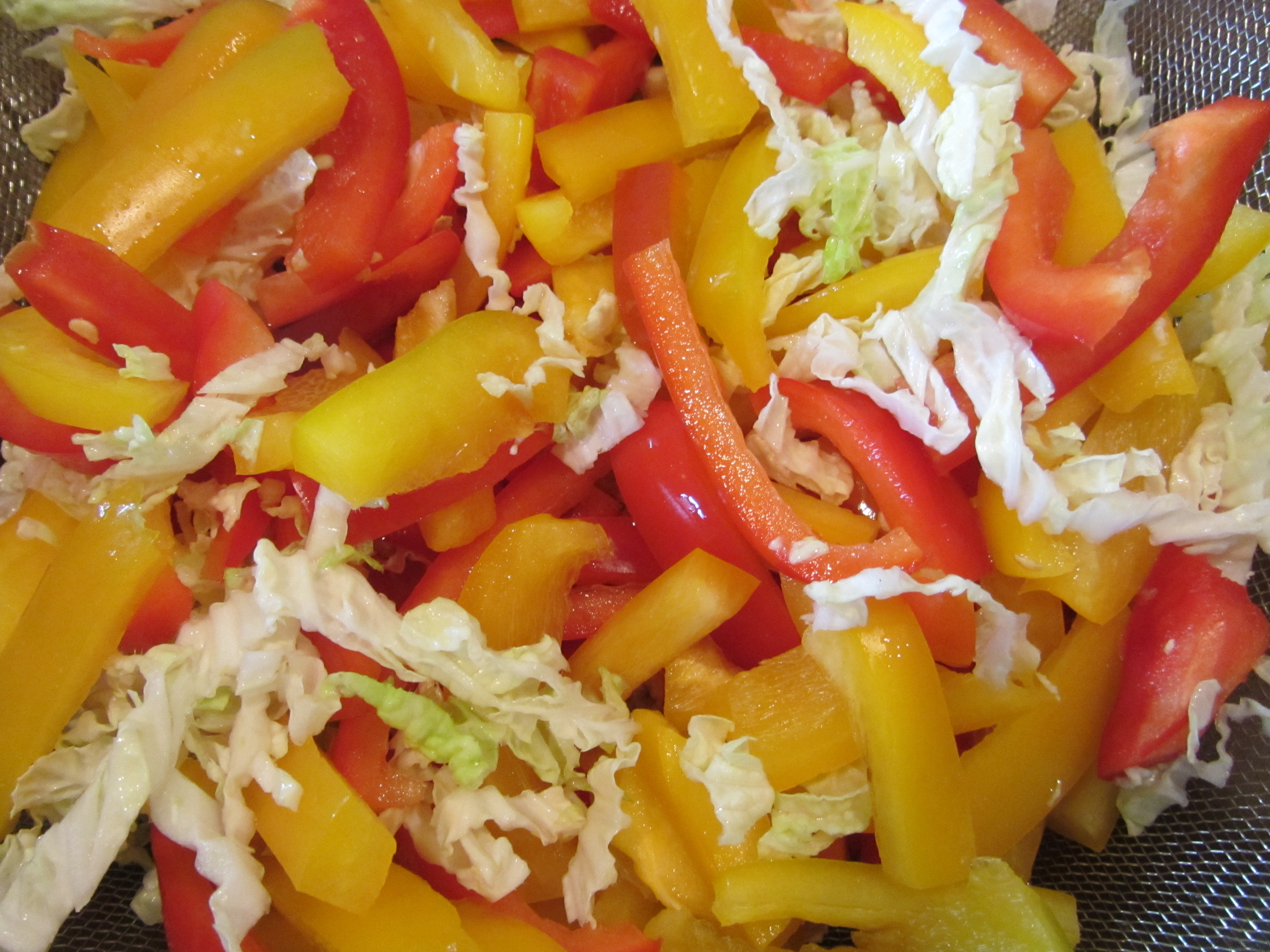 Shredded Napa cabbage, along with bell peppers, set aside to drain.
