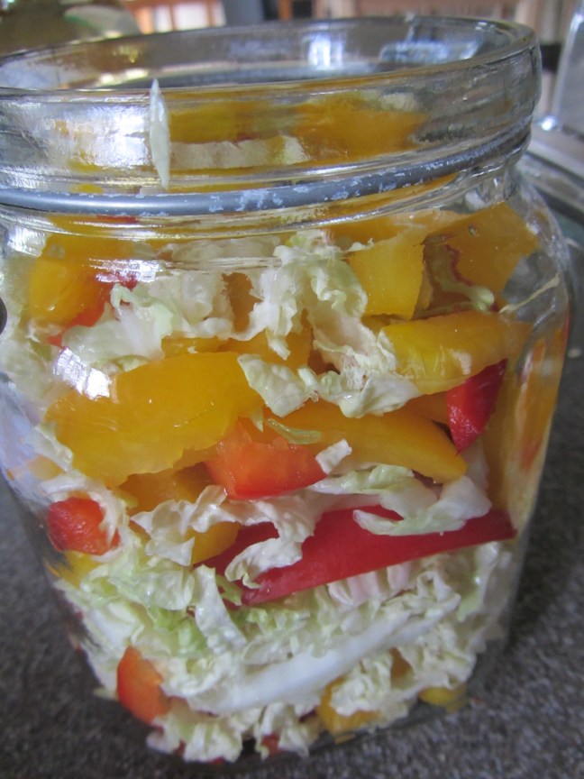 Shredded Napa cabbage, along with bell peppers, packed into a jar.