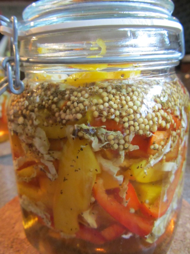 Hot marinade poured over slaw.
