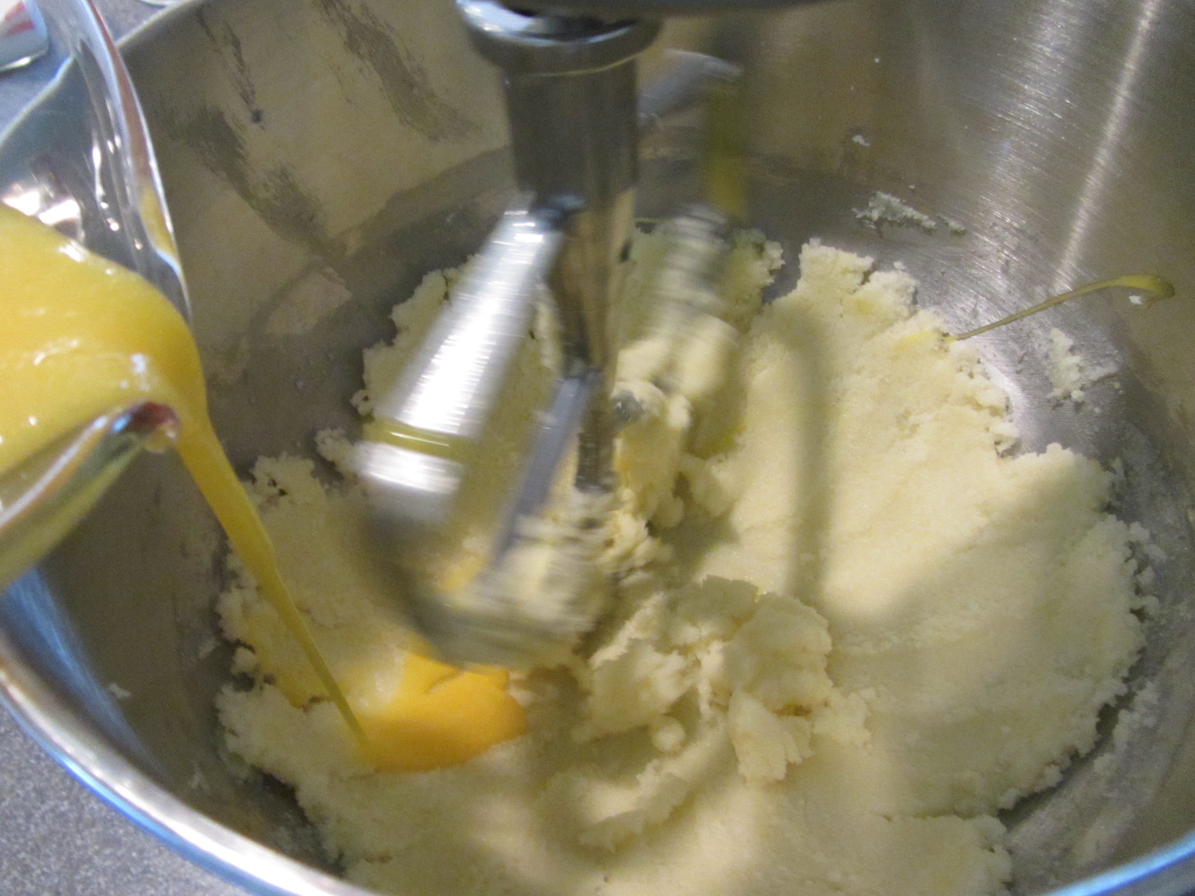 Egg yolks being slowly added to the bowl.