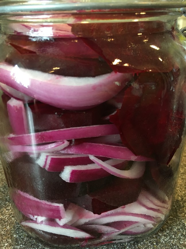 Alternating layers of beets and red onion.