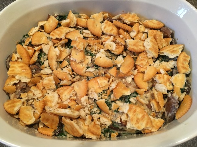 Ritz crackers sprinkled over the top of the casserole.