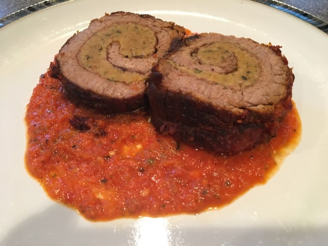 Alton’s finished braciole with tomato sauce.