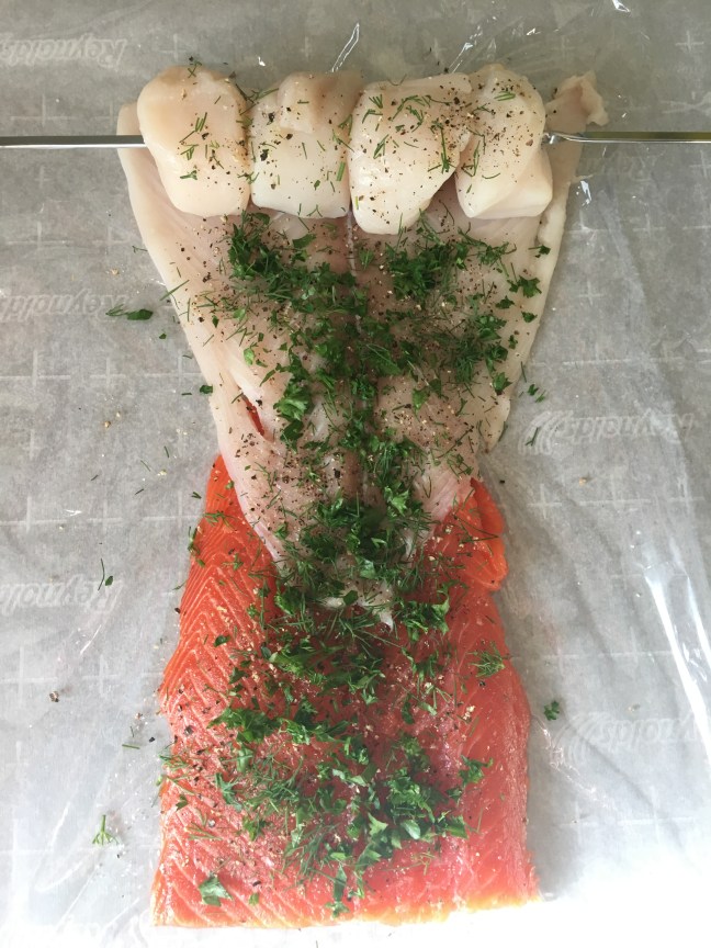 Skewered scallops placed on far end of flounder. Fish seasoned with Kosher salt, pepper, fresh dill, and fresh parsley.
