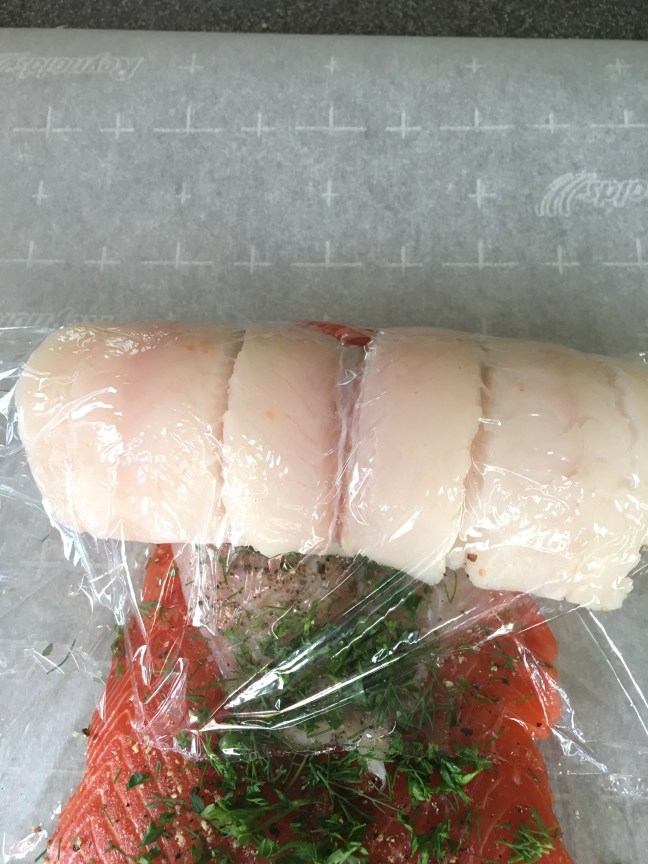 Pulling the plastic toward me to roll the fish around the scallops.