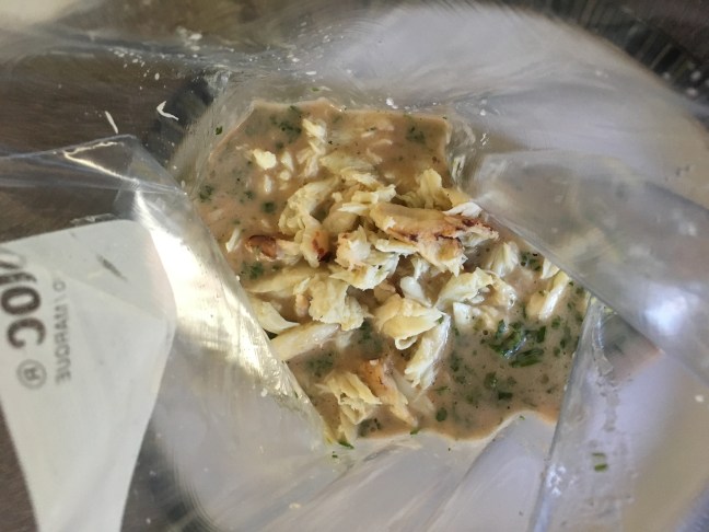 Marinade and crab in plastic bag.