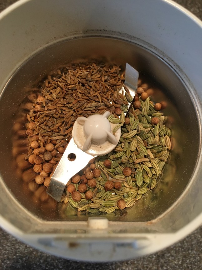 Fennel seed, coriander seed, cumin seed in the spice grinder.