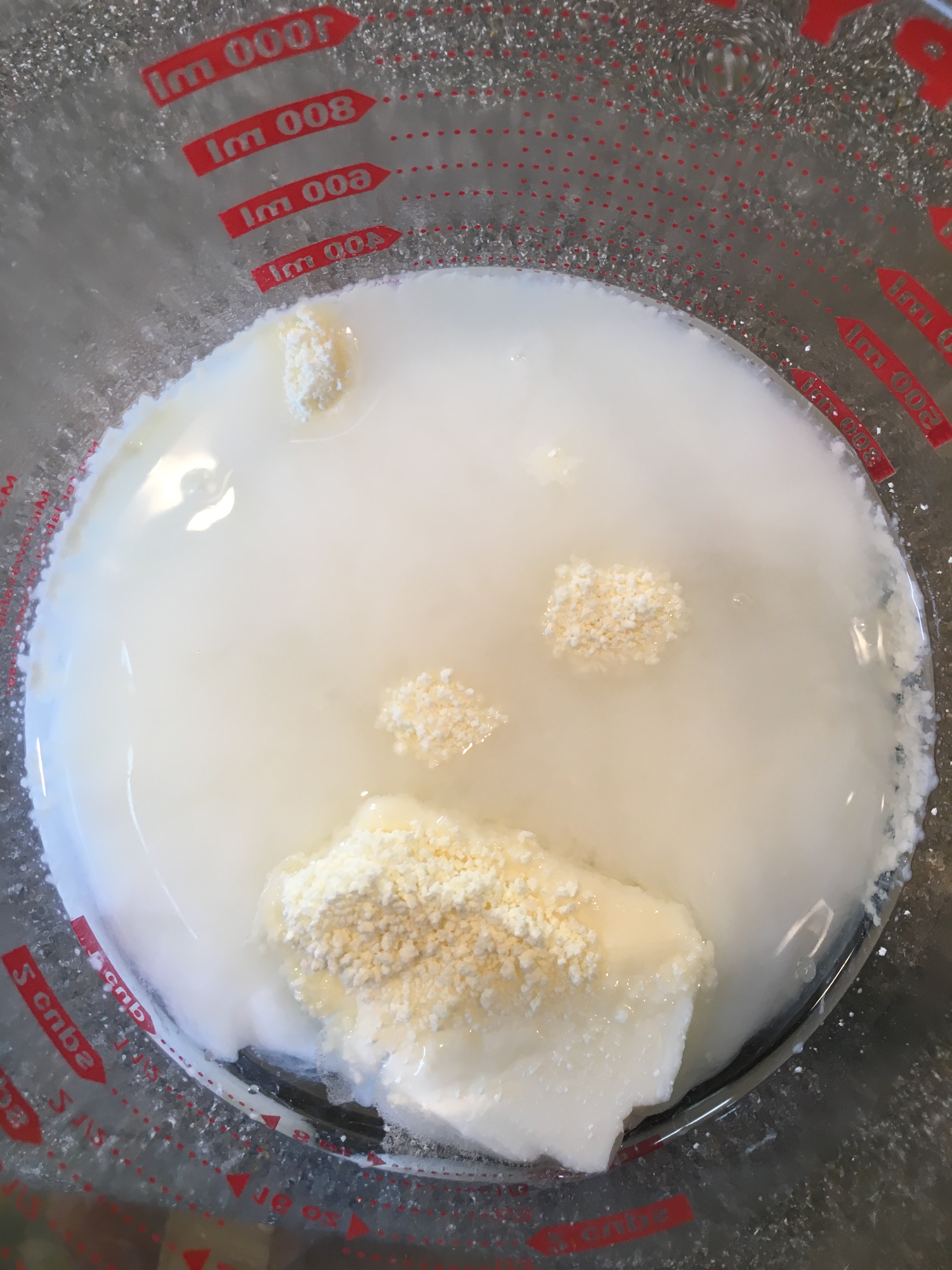 Wet ingredients: hot water, shortening, sugar, salt, and milk powder.