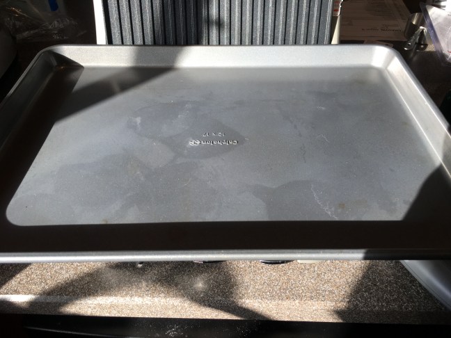 Sheet pan placed on top of rings while muffins cook for 5 minutes.
