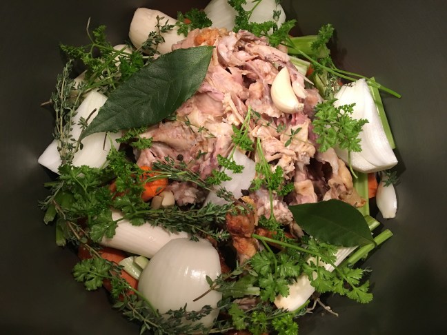Parsley, thyme, and bay leaves added to vegetables and chicken.