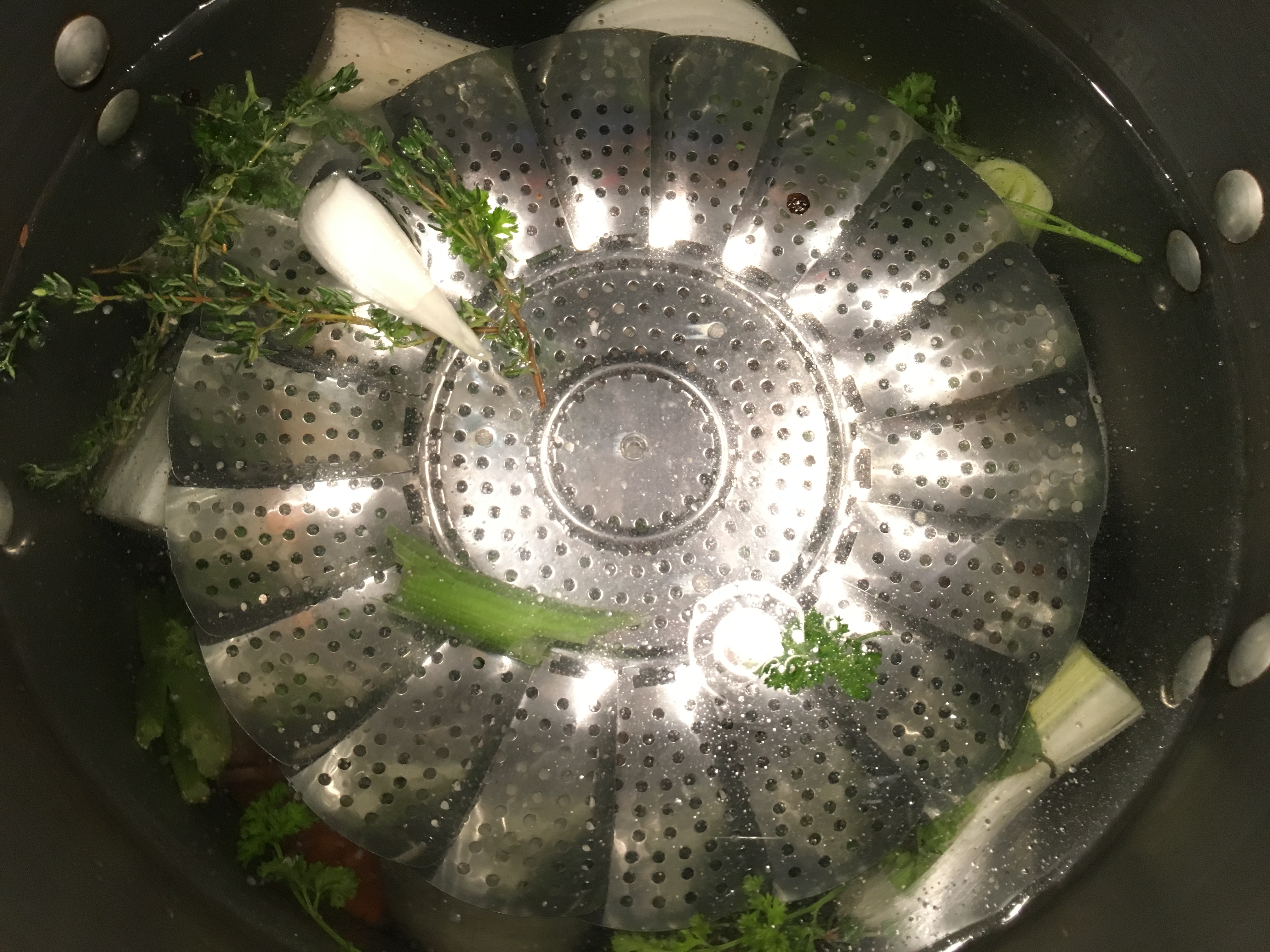 Steamer basket used to keep chicken/vegetables submerged in two gallons of cold water.