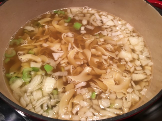 Cooked egg noodles added to soup.