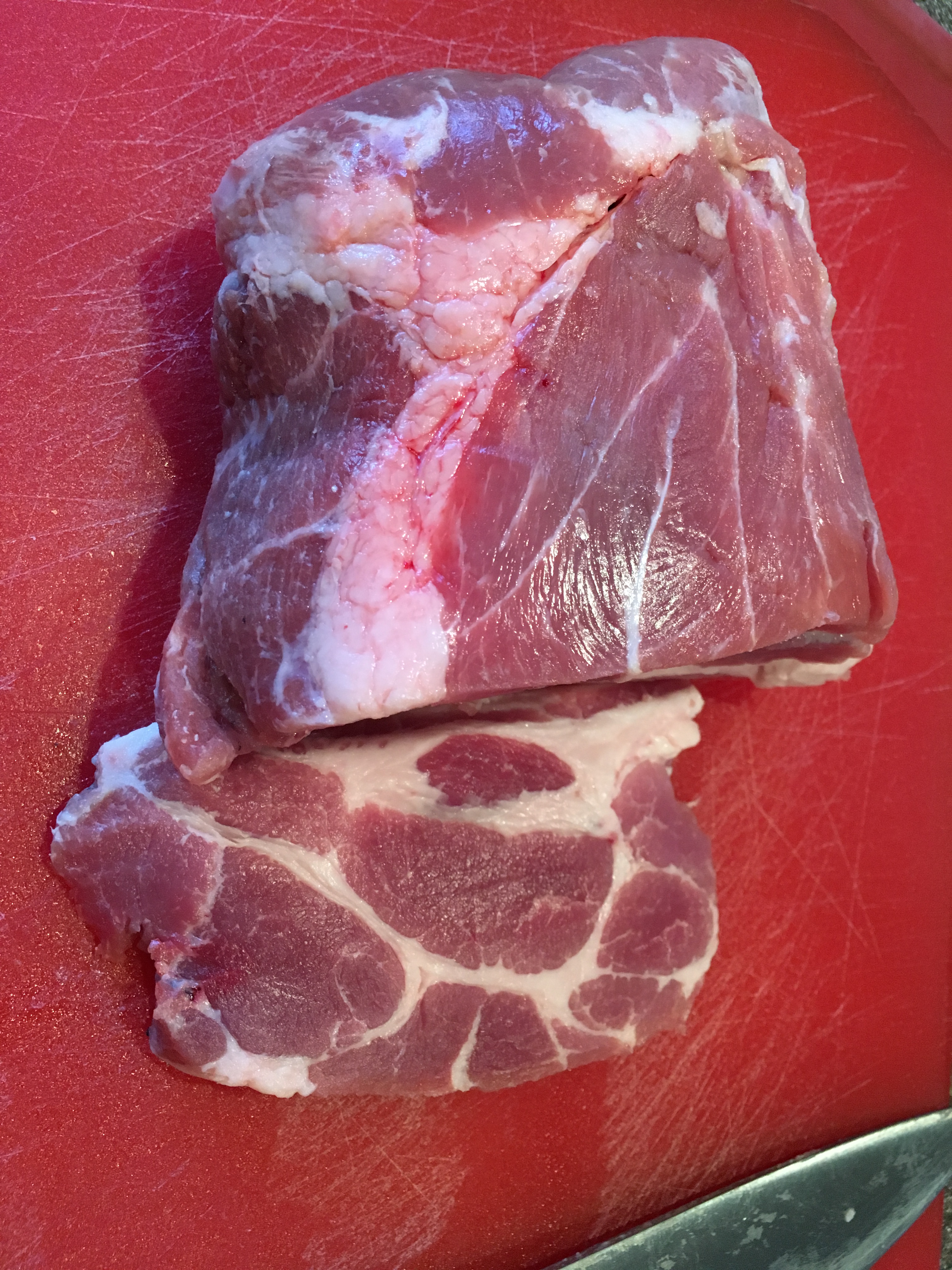 Two pounds of pork butt, ready to be cubed.