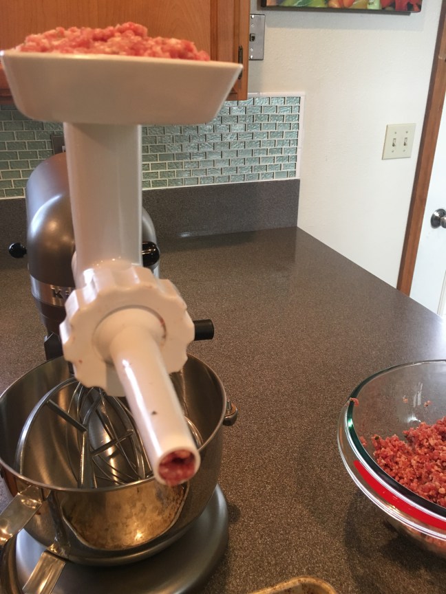 Ground sausage, loaded into the hopper.