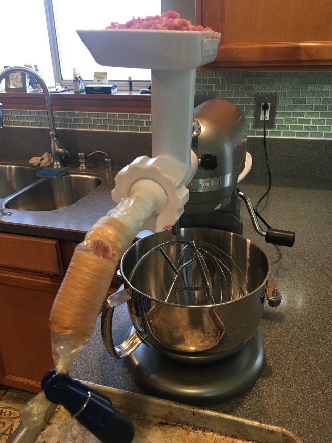 Collagen sausage casing, loaded onto nozzle. Casing needs to be pushed all the way on.