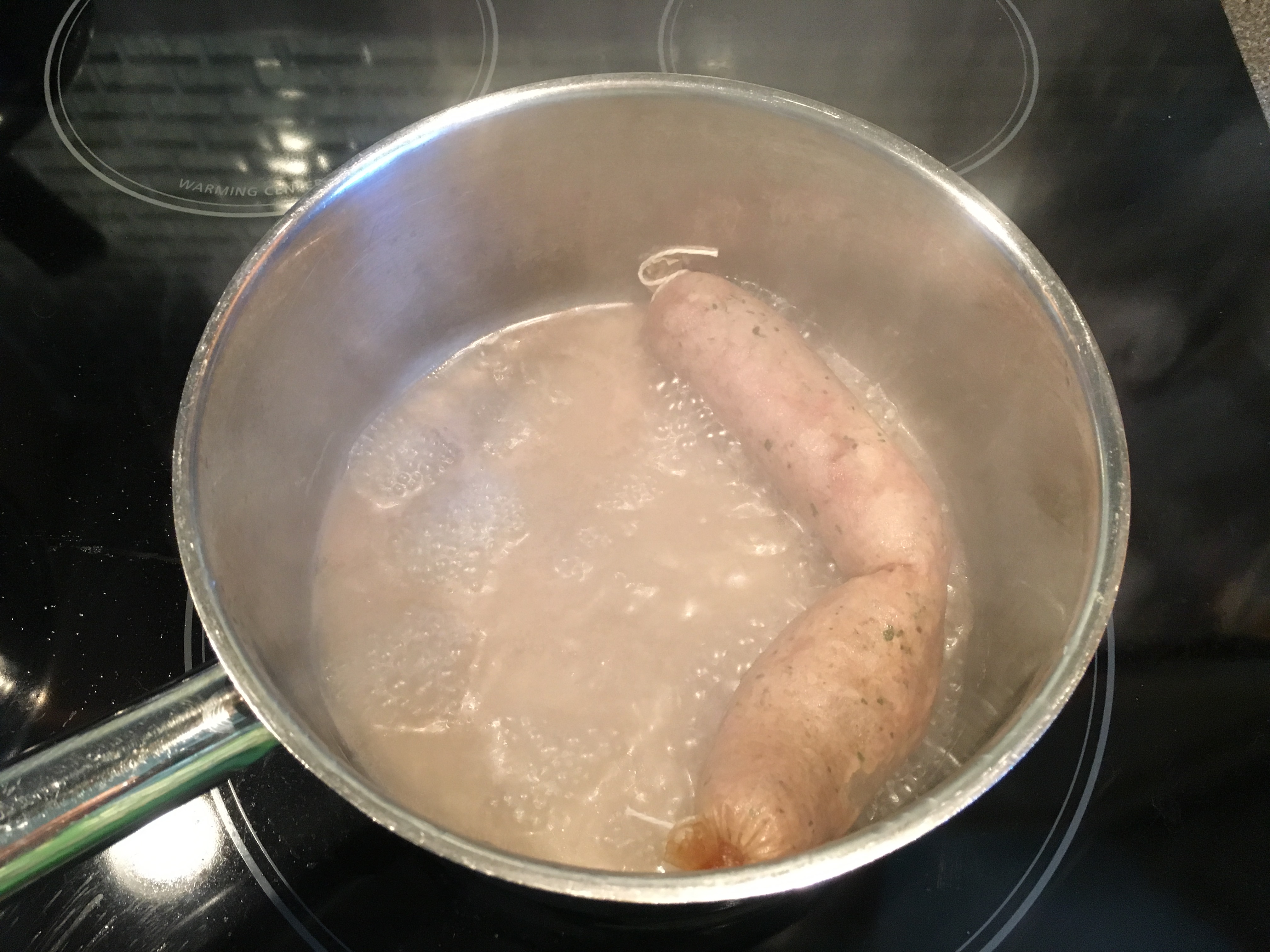 Sausage links placed in lidded pan with 1/4-inch of water and cooked until 150+ degrees.