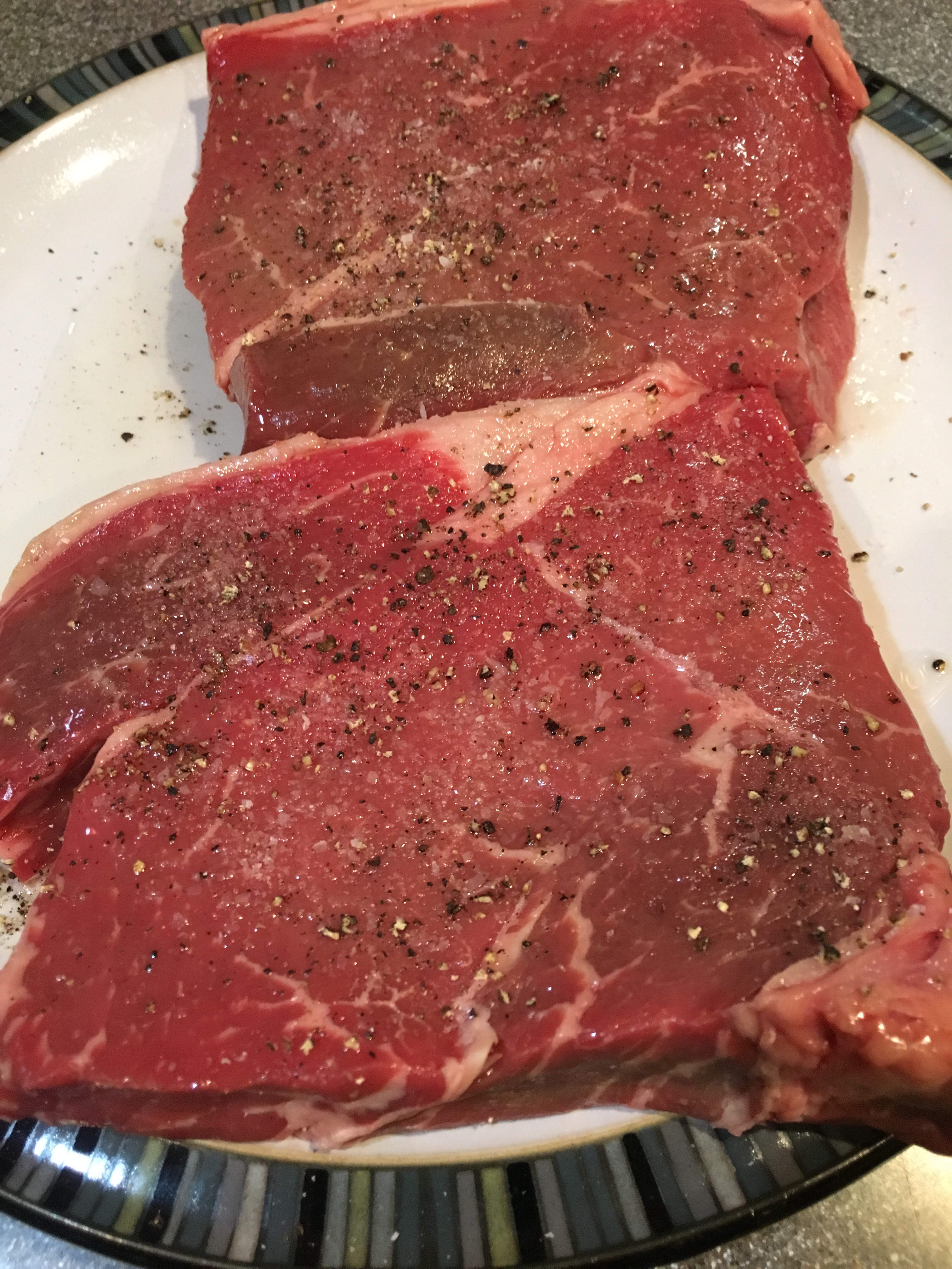 Steak, oiled and seasoned with salt and pepper.