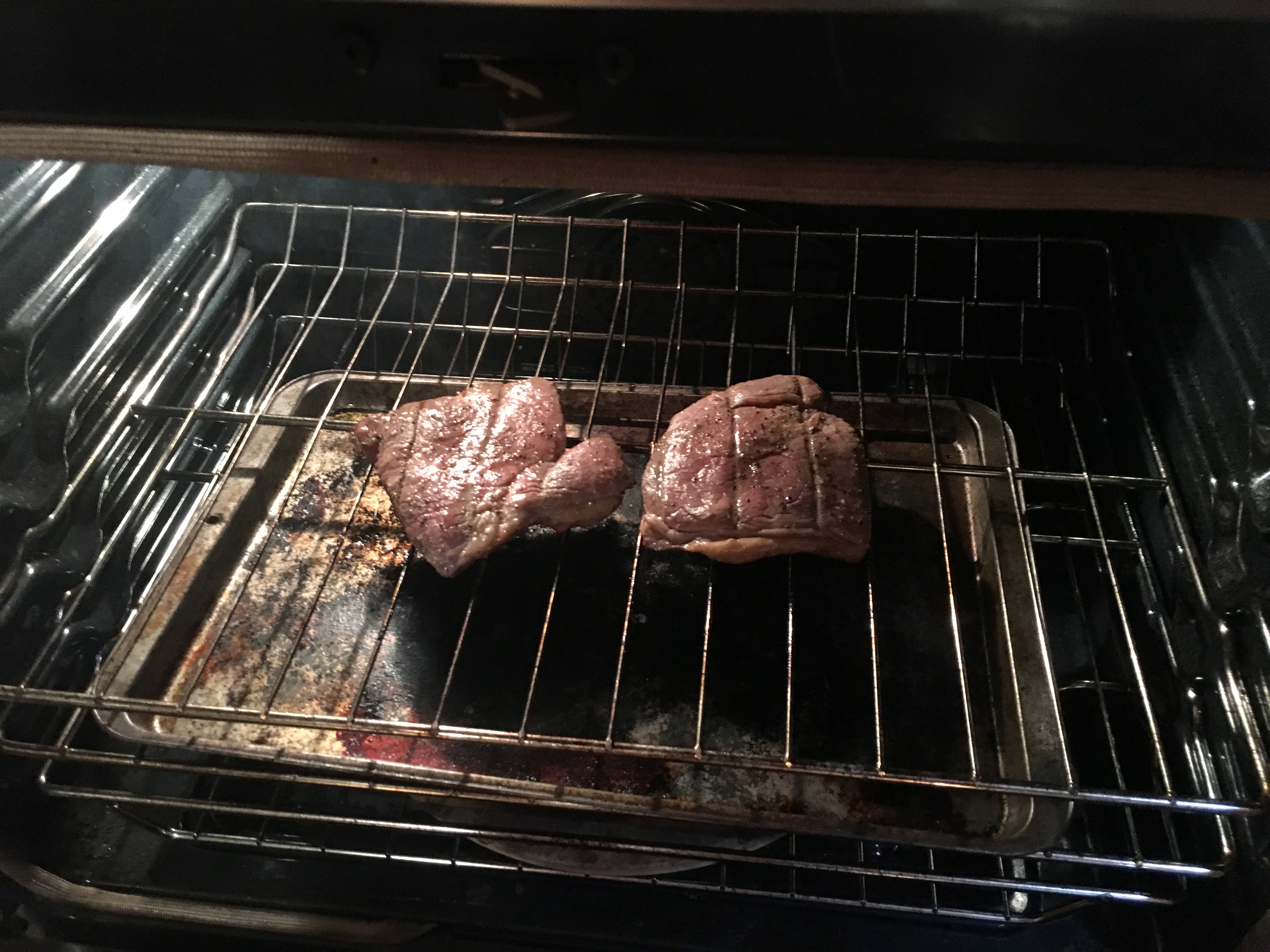 Steaks, flipped over after five minutes. Left to broil for 5 more minutes before moving up to second highest rack position.