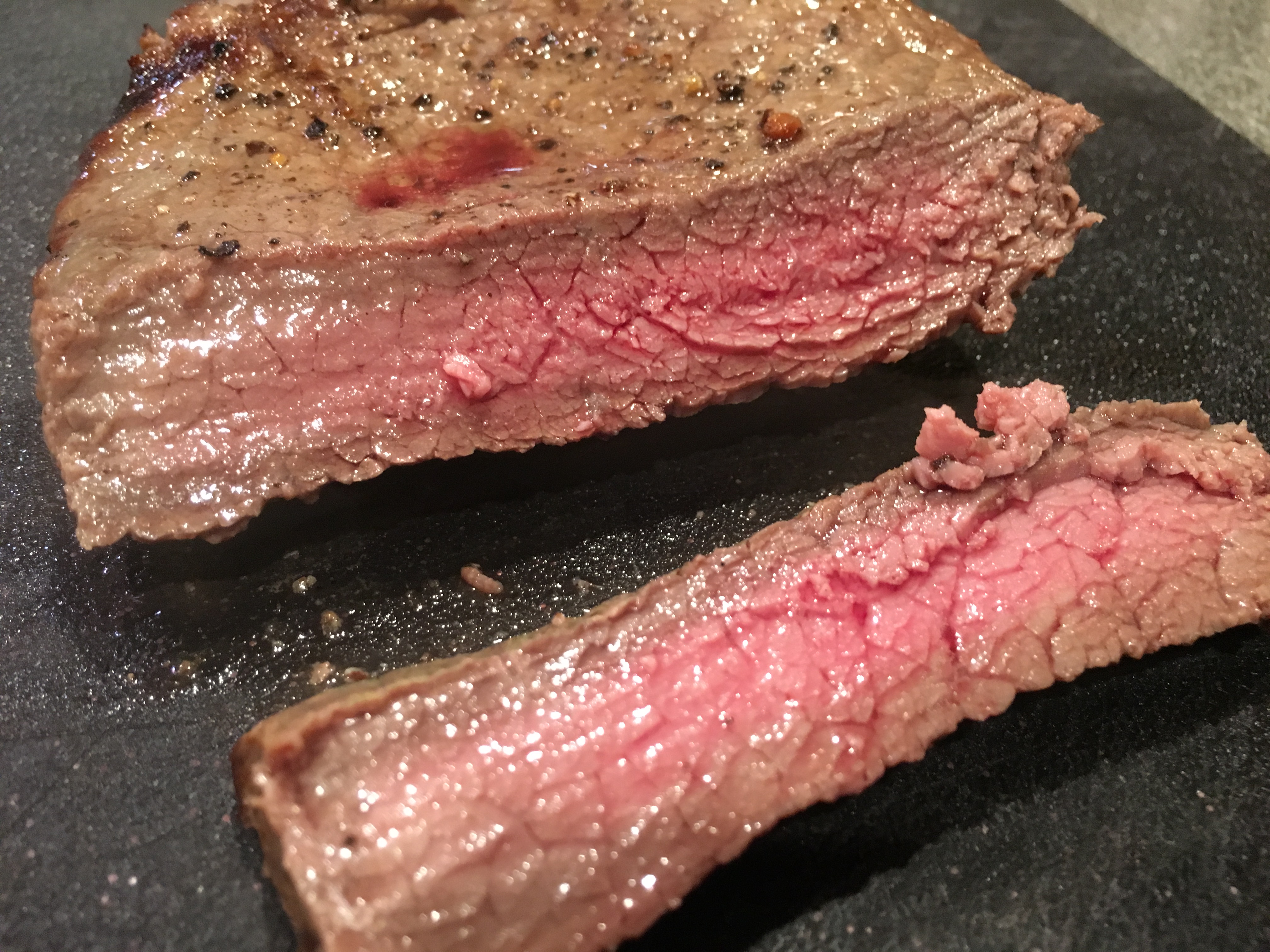 Finished steak, sliced on the bias.
