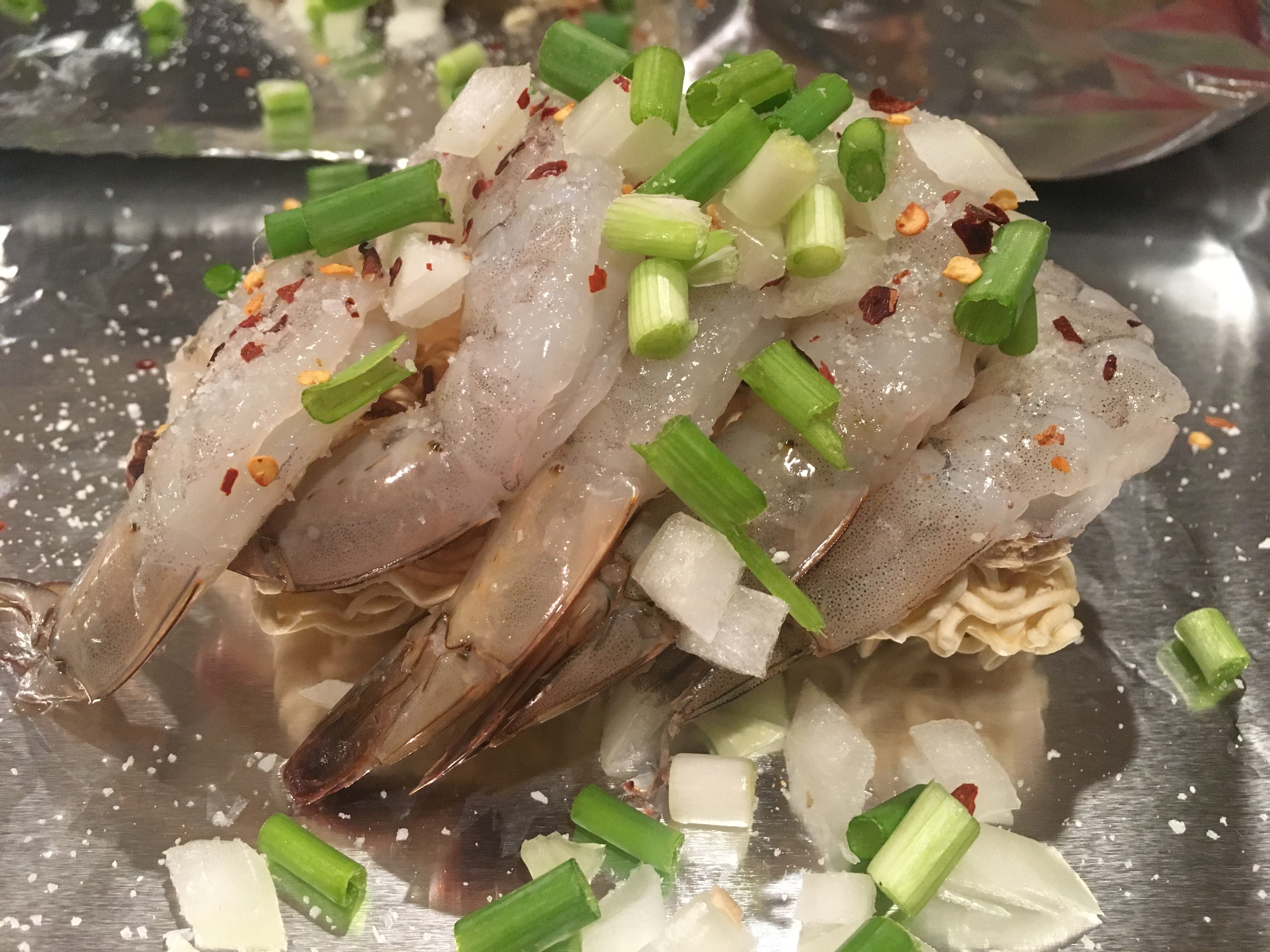 Shrimp seasoned with red pepper flakes and Kosher salt.
