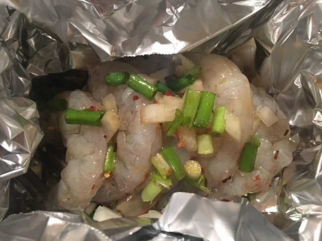 Foil balled up around shrimp and liquid ingredients added.