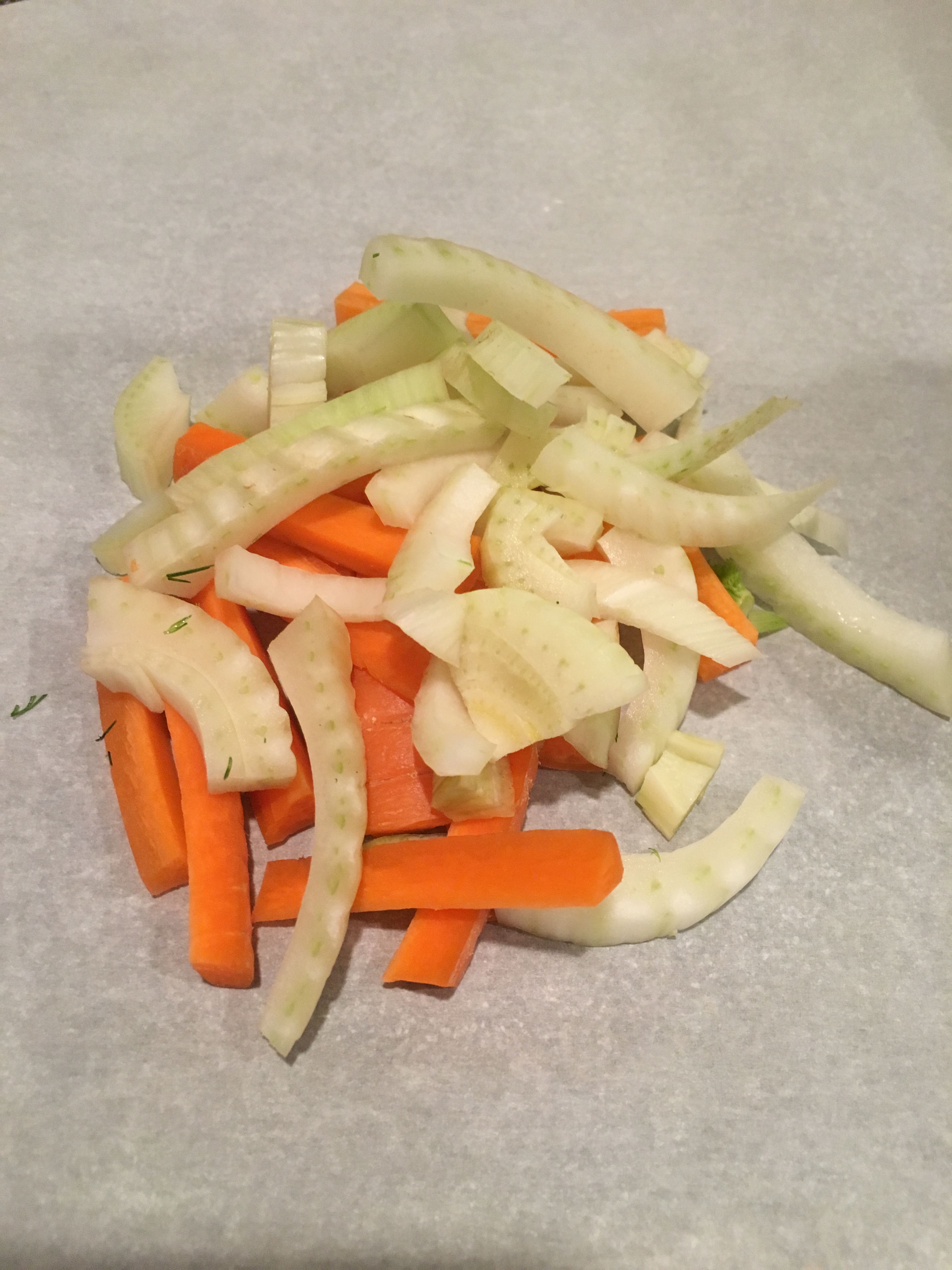 1/3 C carrots and 1/3 C fennel on right side of parchment heart.